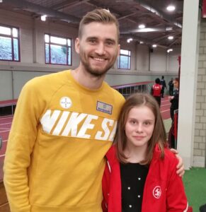 Spannend wurde es am Wochenende auch für Leni Groos (W13), die sich an der Schreib-Challenge des Leichtathletikverbandes Nordrhein zur Europameisterschaft beteiligt hatte und dazu im Rahmen der Nordrheinhallenmeisterschaften eingeladen wurde. Neben der Preisverleihung und Auszeichnung war für Leni der Höhepunkt zu einem meet and greet mit Mateusz Przybylko (Europameister im Hochsprung 2018). Dieser erzählte im Interview, daß er mit 12 Jahren zur Leichtathletik kam und zunächst mehrere Disziplinen ausprobierte, bevor er sich auf den Hochsprung konzentrierte. Mateusz, der sich sichtlich über die Junge Athletin im Trikot des Weseler TV freute, nahm sich extra etwas Zeit um die Fragen der Preisträger zu beantworten, bevor das obligatorische Selvie geschossen wurde.