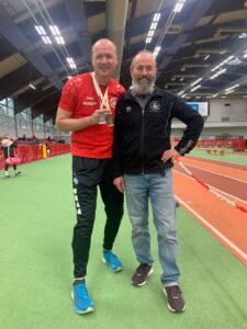 Am Sonntag ging Marcel Haupt bei den Senioren M45 über 200m und im Dreisprung an den Start und holte sich dabei Silber und Gold. Über 200m lief er in 26,02sec zu Silber in neuer persönlicher Bestzeit. In seiner Paradedisziplin dem Dreisprung, holte er mit 11,83m Gold mit neuer persönlicher Bestweite. Dementsprechend gut gelaunt präsentierte sich Trainer und Athlet nach dem Wettkampf. Trainer Wolfgang Schroller: „Marcel hat heute alles umgesetzt, woran wir die letzten Wochen gearbeitet haben, neben den Medaillen sind auch zwei neue persönliche Bestzeiten herausgesprungen. Zudem ein Prima Test für die Deutschen Seniorenmeisterschaften nächste Woche in Dortmund.“
