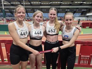Maleen Gruhn (W14), ging über 60m Hürden an den Start, trotz einer neuen persönlichen Bestzeit von 11,11sec kam Maleen nicht in den Endlauf. Auch Katharina Peplau (W14) holte sich über 800m eine neue persönliche Bestzeit in 2:50,24min. In der 4x200m Staffel mit Groos, Schumann, Gruhn und Peplau holte sich die Staffel und ihrem Lauf in 2:05,28min den dritten Platz.