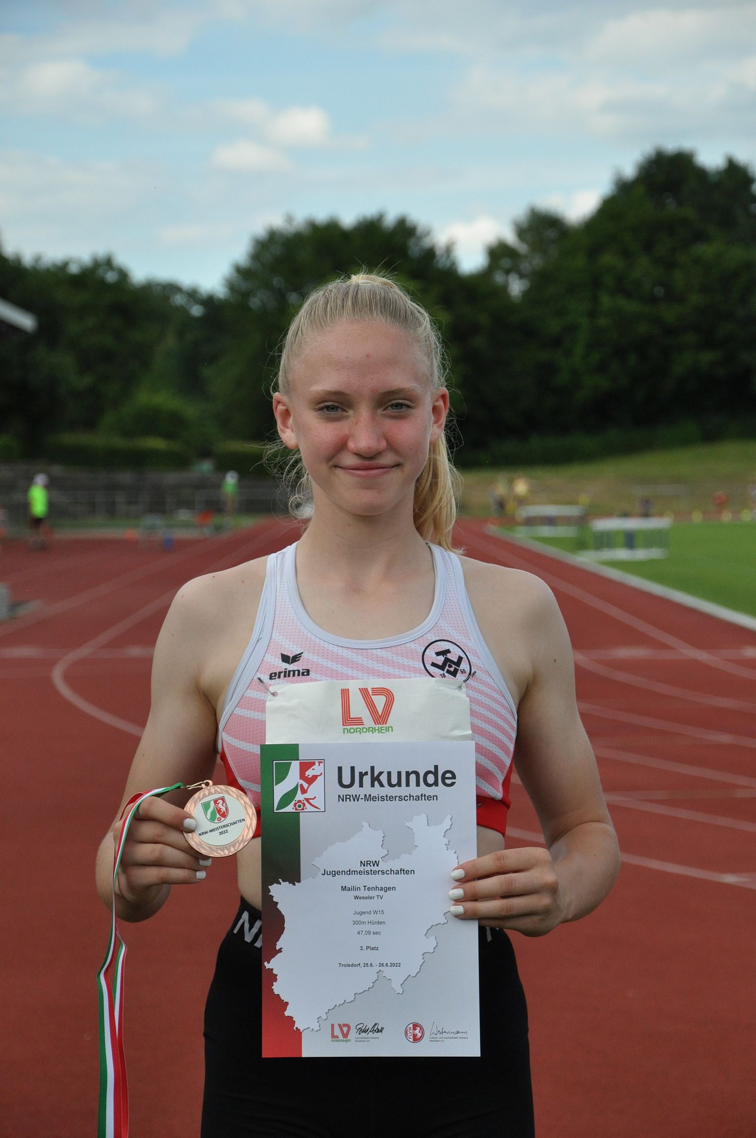 Alea Kutschenreiter U18 Athletin trat im Dreisprung an. Alea startete mit einem Sicherheitssprung von 9,69m. Den zweiten Versuch übertrat sie, so dass sie sich langsam an den richtigen Absprungpunkt herantastete. So konnte sie schließlich im letzten Versuch bei 10,19m landen, was auch an ihre Bestweite heranreichte, womit sie sich Platz 7 sicherte. Ebenfalls im Dreisprung startete Mailin Tenhagen (W15) in den Wettkampftag. Mit 9,74m verpasste sie den Einzug unter die besten 8 und damit drei weitere Versuche. Das beutete Platz 10 für Mailin. Ihr Trainer Roy Sib:“ Alea hat sich sehr schön von Sprung zu Sprung gesteigert, mit den 10,19 können wir zufrieden sein, Potential ist auf jeden Fall vorhanden, wir werden uns jetzt an die 11m heranarbeiten. Für Mailin war es schade, sie kann auch über 10m springen, aber das sollte heute nicht sein. Dafür lief Mailin ein sehr gutes Rennen über 300m Hürden.“ Mailin startete im dritten und letzten Zeitendlauf über 300m Hürden und lieferte sich ein packendes Finish. Quasi erst mit dem Zieleinlauffoto war erkennbar, dass ihr Konkurrentin Johanna Burchett vom TV Gladbeck die Brust 5tauselstel vor Mailin über die Ziellinie schob, womit sie dennoch Bronze in den Fahren des Weseler TV errang. Vivii Kammerknecht (W15) startete über 100m und holte sich Platz vier zeitgleich mit Eleni Schöpgens in 13,09sec. Hier war tatsächlich nicht zu unterscheiden, wer die Nase vorne hatte, so dass beide mit gleicher