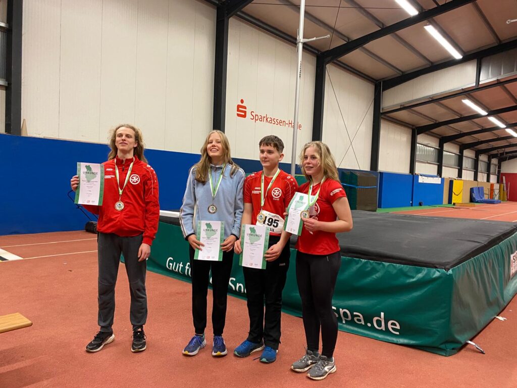 Bei den Schülern U14, holte Marlena Reintjes W12 zweimal Gold und einmal Bronze beim Wurf. Der Diskus landete bei 13,04m und der Speer bei 11,92m zu Gold. Die Kugel stieß sie auf 4,46m zu Bronze. Die 60m Hürden lief sie in 14,02sec auf Rang 9. Carl Ridder M12 holte sich Gold mit der Kugel über 6,39m, die 60m Hürden lief er 13,87sec zu Bronze und die 60m lief er in 10,17sec auf Rang 6. Paul Peplau M12 wurde 3. über 60m in 9,79sec und wurde mit Bronze belohnt. Die 60m Hürden lief er in 14,81sec auf Rang 4. Phil Derksen M12, holte Bronze über 60m Hürden in 14,23sec und lief die 60m Flach in 9,96sec auf Rang 4. Lenja Kobus W13, holte sich Silber im Speerwurf mit 15,87m, die 60m Flach lief sie in 10,25sec auf Platz 13. Emma Kurz W13 wurde 11. über 60m in 9,81sec.