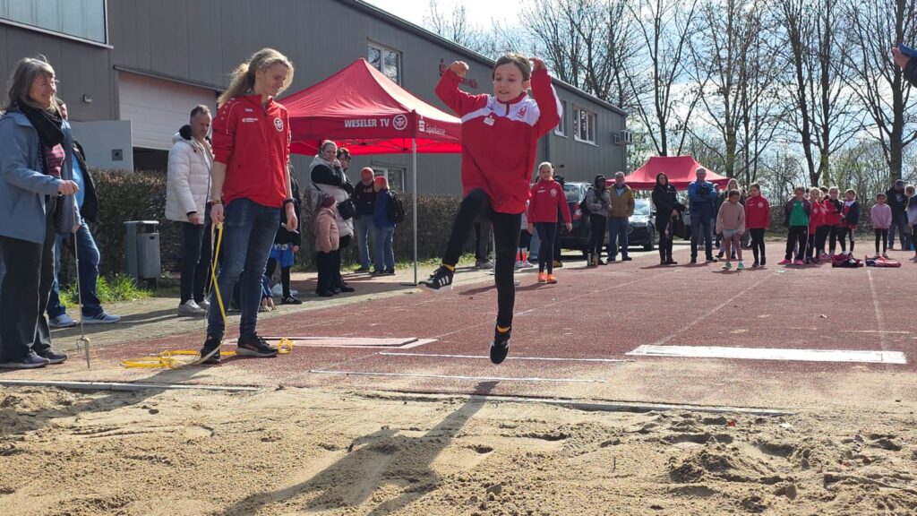 Auch bei den Mädchen gab es zahlreiche erfreuliche Resultate. In der W13 verbesserte Marlena Reintjes ihre Weitsprungbestleistung auf 3,65m und belegte damit Rang sechs in einem großen Teilnehmerfeld. Bei den Mädchen W12 zeigte Carolina Lynker mit 3,5 m einen stabilen Wettkampf, während Thea Friedrich mit 3,20m eine weitere Punkteplatzierung für den Weseler TV sicherte. Die W10 Mädchen überzeugte mit großer Breite, Tilda K. (3,17m), Romy M. (3,10m), Charlotte W. (3,13m) und viele weitere Mädchen lieferten geschlossene Leistungen und demonstrierten das große Potenzial der jüngsten Weseler Sprungtalente.