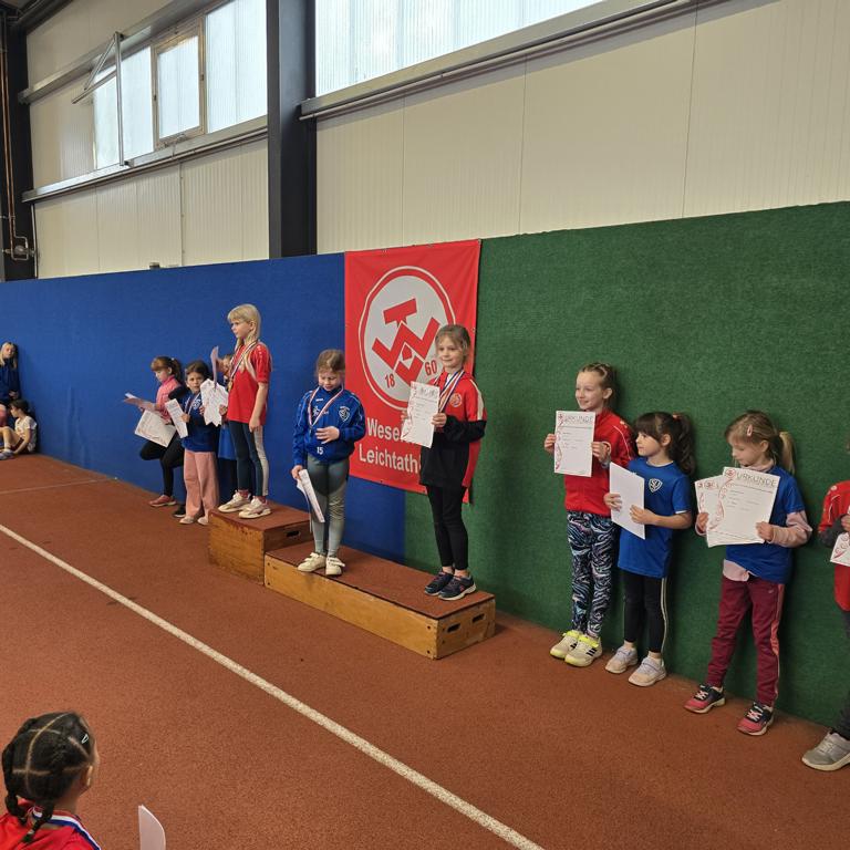 In der jüngsten Mädchenklasse (Jahrgang 2020) stellte der Weseler TV den Großteil des Starterfeldes. Marie S. setzte sich im Weitsprung mit 2,08 m an die Spitze, dicht gefolgt von Zaya I. (1,99 m), die auch im Sprint Zweite wurde (7,01 s) und im Medizinballstoß Rang zwei belegte. Hannah W. und Ida J. folgten auf den Plätzen drei und vier im Weitsprung. Ein rundum überzeugender Auftritt der Jüngsten WTV-Kids. Bei den jüngsten Jungs (Jahrgang 2020) zeigte Len B. eine ausgezeichnete Vorstellung: Er gewann den Weitsprung mit 2,08 m und lief im Sprint auf Platz zwei (7,37 s). Ioannis V. und Arne K. sammelten ebenfalls wertvolle Erfahrungen und platzierten sich im Mittelfeld.